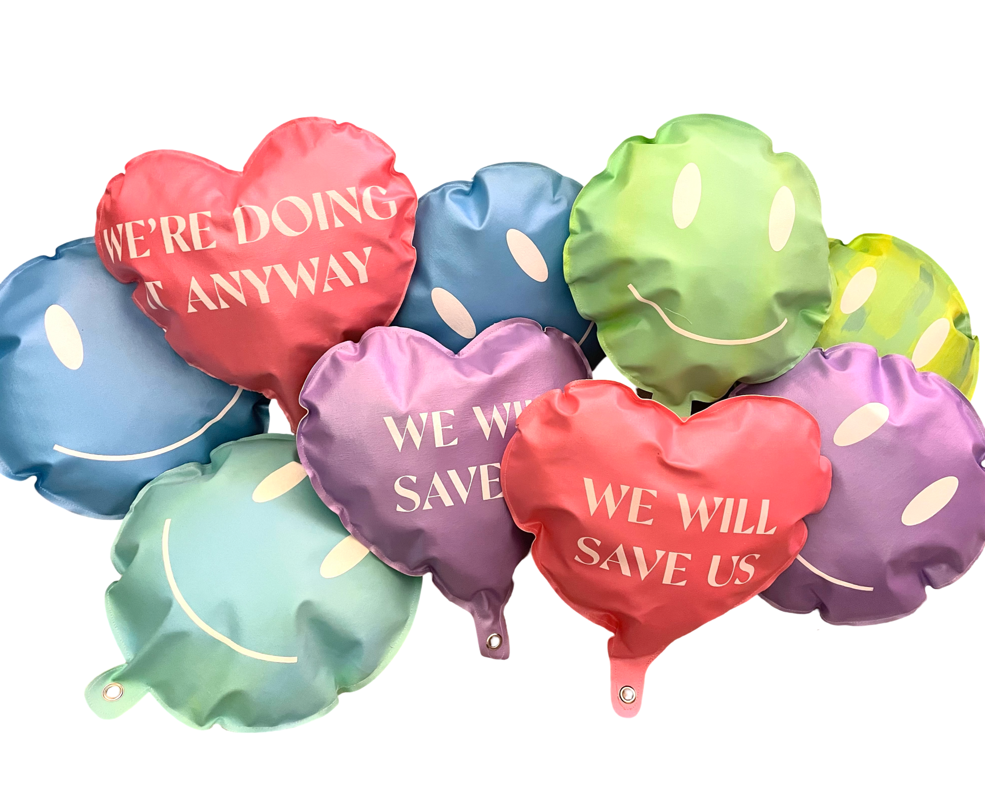My recent series of Forever Balloons and Charm Chains use canvas as the foundation for sculptures that reimagine household items as faux inflatables. Somewhere on the precipice of illusion and delusion (can you believe I work into the wee hours of the morning making fake balloons for a living?) I hope to imbue some magic and levity upon the viewer.